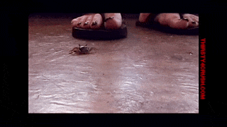 Nina has a bunch of small crawdads and she is ready to feel them crunch under her beautiful neon sandaled feet. she crushes them one by one with slow twist crushing them little by littleby little until the are mush under her feet.